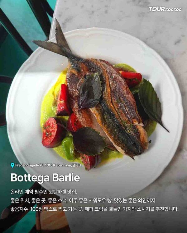 Bottega Barlie는 현지인들에게도 사랑받는 미식 레스토랑입니다. 사워도우 빵과 와인, 계절 요리가 특히 유명합니다. 예약을 권장할 만큼 인기 있는 곳이라 코펜하겐 여행코스에 포함하면 특별한 경험이 됩니다. 덴마크 코펜하겐에서 미식을 원한다면 반드시 방문해야 할 곳이죠.