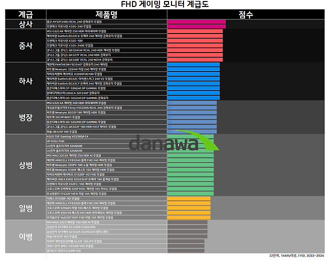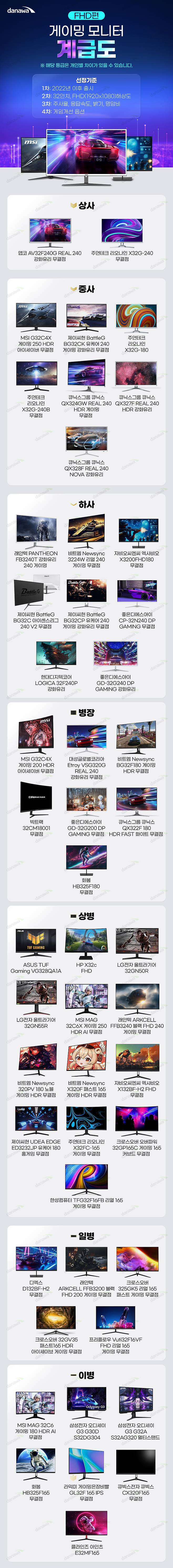 32인치 FHD 게이밍 모니터 중 최상급 제품을 찾는다면 상사 등급의 두 제품이 가장 적합할 것이다. 이 모델들은 240Hz 주사율과 1ms 응답속도를 제공하며, 350cd/㎡의 밝기와 4000:1의 높은 명암비를 갖추고 있다. 또한 G-Sync Compatible, FreeSync, Adaptive Sync 등의 3가지 기본형 게임 개선 옵션까지 포함돼 빈틈없는 성능을 보여준다. 다른 등급과의 가격 차이도 크지 않아 가성비 측면에서도 탁월한 선택이 될 수 있다.