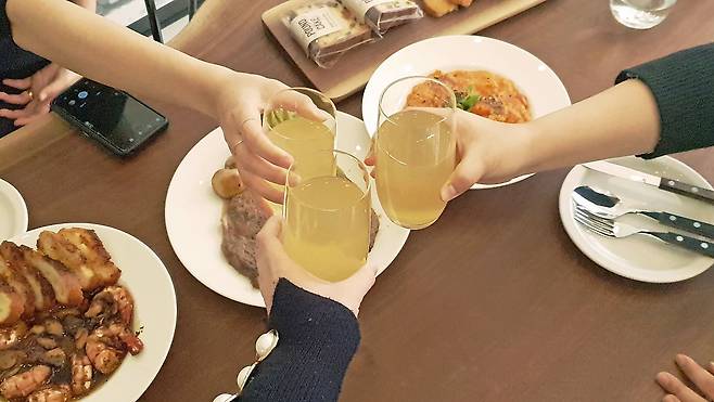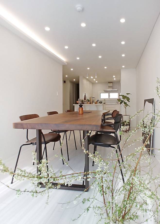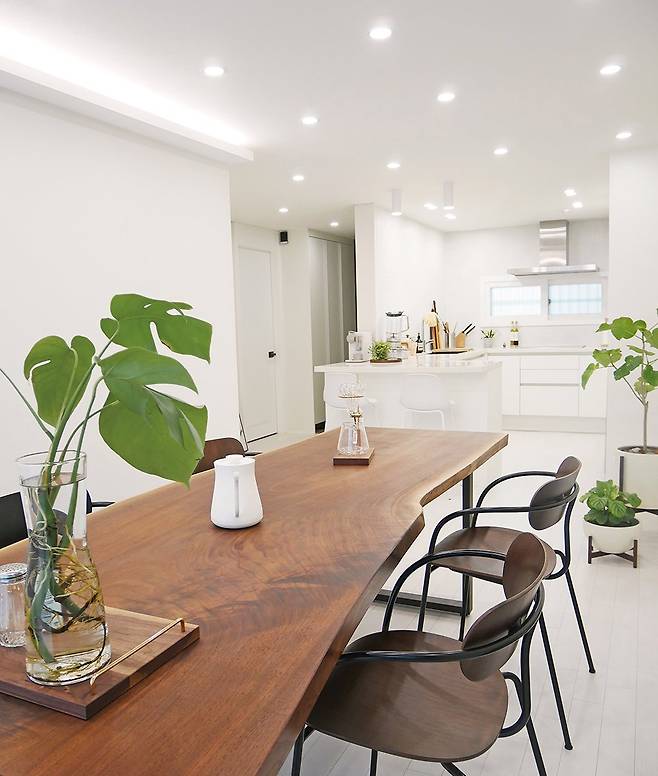 TV를 잘 보지 않는 저희 부부는 거실에서 TV와 소파를 과감히 없애고 중앙에 커다란 식탁을 배치해, 따뜻한 분위기의 홈카페를 꾸몄어요. 종종 이곳에서 남편과 식사도 해결하고 커피 한 잔, 와인 한잔하면서 대화하는 시간을 가지거나 손님들을 초대해 홈 파티를 즐긴답니다.