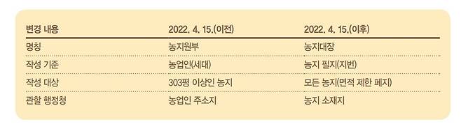 농지대장은 행정 관서에서 농지의 소유나 실태를 파악해 효율적으로 관리하기 위해 작성하는 장부를 말합니다. 농부의 입장에서는 ‘농사 자격증’이라고 할 수 있겠습니다. 참고로 2022년 4월 15일부터 농지법 시행령 규칙 개정에 따라 명칭이 농지원부에서 농지대장으로 변경됐으며 주요 개선 사항은 다음과 같습니다.