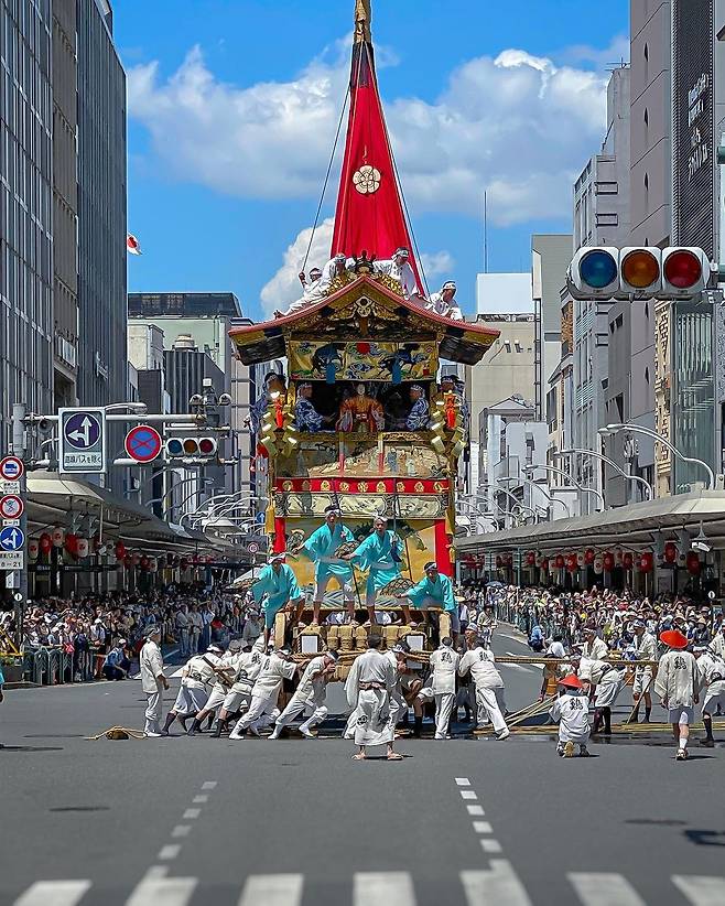 교토 기온 마츠리는 869년 일본 전역에 퍼진 역병을 달래는 제사에서 시작했어요. 당시 역신을 수레에 태워 소각하거나 강물에 버리는 의식을 진행하곤 했는데, 의식 후 역병이 사라졌다고. 그것이 유래가 되어 기온 마츠리는 건강과 안녕을 기원하는 축제로 지금까지 이어지고 있어요. 또 2009년에는 유네스코 무형문화유산에도 등재된, 교토에선 빼놓을 수 없는 축제예요!
