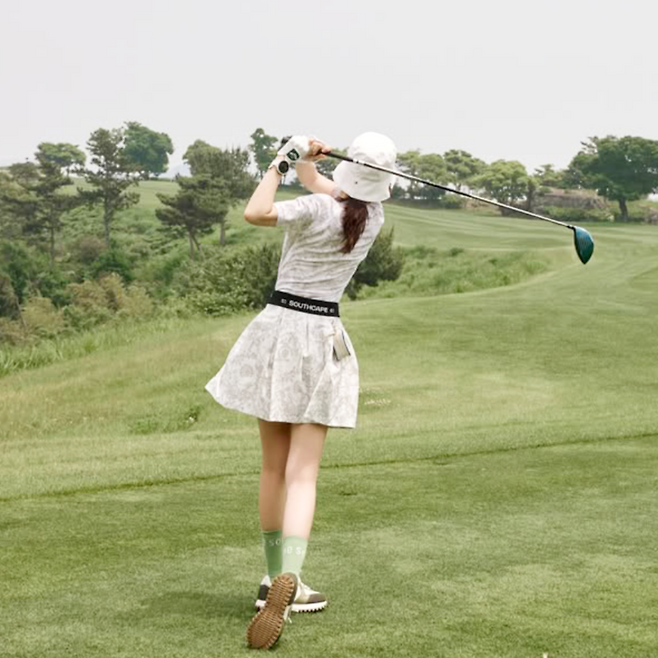 화이트&페일 민트 조합, 여름 골프장의 정답 엄지원이 선택한 룩은 전체적으로 부드럽고 시원한 톤이 인상적입니다. 화이트 바탕에 은은한 패턴이 들어간 티셔츠와 스커트 셋업, 군더더기 없는 디자인이 단정하면서도 경쾌한 인상을 줍니다.
