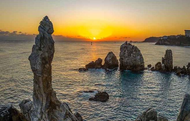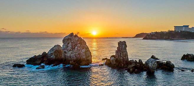 바다 한가운데 촛대처럼 치솟은 바위, 그 사이로 떠오르는 태양.