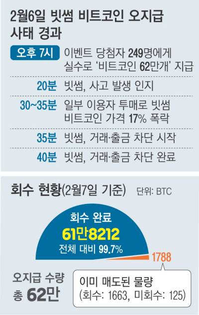 빗썸 측이 사고를 알아차린 건 20분이 지난 오후 7시20분이었다. 거래·출금 차단조치는 20분이 더 지난 7시40분에야 완료됐다. 빗썸은 오지급된 비트코인의 장부 숫자를 ‘원위치’하는 방식으로 99.7%의 코인을 회수했다고 밝혔다.