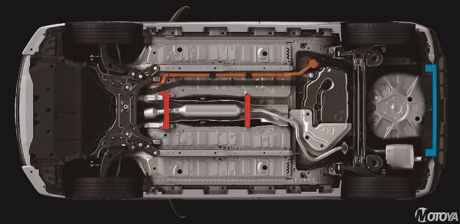 아쿠아 GR 스포츠가 일반형 모델과 가장 큰 차이를 갖는 부분은 단연 섀시에 있다. 글로벌 아키텍처를 기반으로 개발된 아쿠아는 그 자체로도 충분한 강성을 가졌지만 GR 스포츠는 더욱 뛰어난 운동성능 및 조종성능 실현을 위해 섀시 전반에 걸쳐 보강을 거쳤다. 먼저 차량의 바닥 하부에 2개의 브레이스 보강재를 덧대는 한 편, 리어범퍼 부근에 전용의 보강재를 추가하여 더욱 탄탄한 비틀림 강성을 갖게 한다.