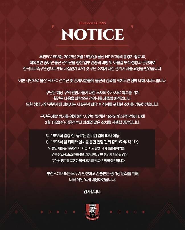부천은 17일 공식 채널을 통해 “부천FC1995는 2026년 3월 15일(일) 울산HD와의 홈경기 종료 후, 회복훈련 중이던 울산 선수단을 향한 일부 관중의 비방 및 이물질 투척 정황과 관련하여 한국프로축구연맹(이하 연맹)으로부터 사실관계 파악 및 구단 조치에 대한 경위서 제출을 요청 받았다”고 밝혔다.