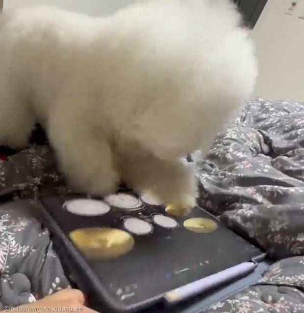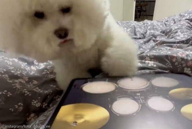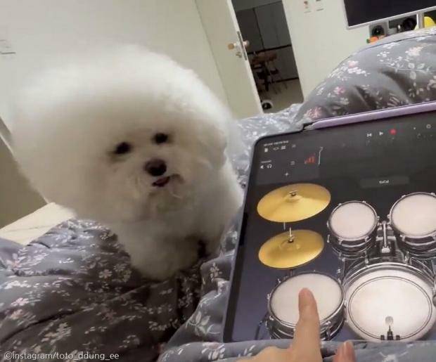 호기심이 발동한 집사는 토토에게 패드를 밀어주며 드럼 치는 방법을 보여줬는데. 그러자 토토는 보호자가 알려주는 대로 드럼을 눌러 소리를 내기 시작했다.