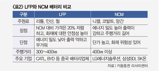 "미국 IRA에 대응하고, 원가 절감에 도움이 되기 때문이다. 무엇보다 향후 전기차 기업의 LFP 배터리 수요가 증가할 것으로 전망된다. K-배터리 3사는 성능이 좋고 고부가가치인 NCM(니켈·코발트·망간) 배터리에 주력했는데, 삼원계 소재 가격이 계속 치솟고 있다 보니 시장에 대응하기 위해 NCM 배터리 대비 20~30% 저렴한 LFP 배터리로 소재를 다양화하고 있다(표2 참조). 삼원계 배터리만 생산하면 가격 변동에 적절히 대응하기 어렵기 때문이다."