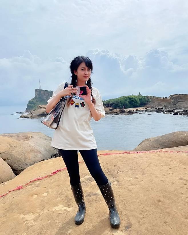 해변에서의 강은비는 화이트 그래픽 티셔츠와 블랙 레깅스로 활동적인 룩을 연출하고 있다. 도트 패턴의 레인부츠가 포인트 아이템으로 작용하며, 실용성과 스타일을 동시에 잡은 아웃도어 패션의 모범을 보여주고 있다. 자연스러운 포즈로 편안함과 활동성을 강조한 코디네이션이 돋보인다.