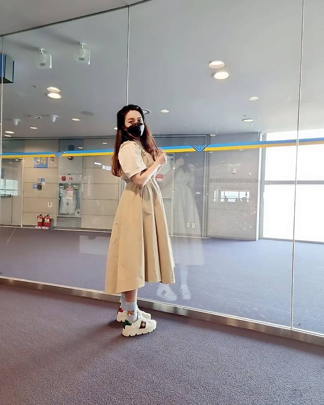 공항에서 포착된 강은비는 베이지 톤의 미디 원피스로 우아함을 연출하고 있다. 허리 벨트로 실루엣을 강조한 클래식한 디자인에 청키한 화이트 스니커즈를 매치해 캐주얼함을 더했다. 검은색 마스크까지 완벽하게 코디네이트한 그녀의 모습에서 세련된 공항 패션의 완성형을 확인할 수 있다.