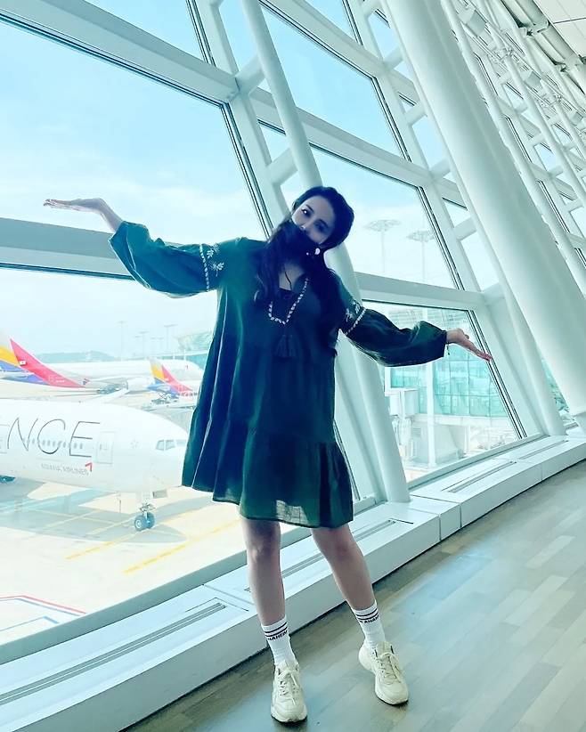 공항 라운지에서의 강은비는 블랙 원피스로 시크한 매력을 발산하고 있다. 레이스 디테일이 돋보이는 미니 드레스에 화이트 스니커즈를 조합해 스포티한 감각을 더했다. 양팔을 벌린 포즈로 자유로운 분위기를 연출하며, 모노톤 컬러의 조화로 세련미를 극대화했다.