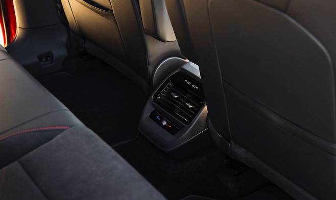 ID.5는 성인 두 명 또는 청소년 세 명이 장거리 여행에도 편안하게 탑승할 수 있는 충분한 뒷좌석 공간을 제공합니다. 경사진 후면 루프라인 때문에 키가 큰 승객의 경우 ID.4에 비해 헤드룸이 5mm 정도 좁지만 큰 차이는 아닙니다. 완전히 평평한 바닥 덕분에 가운데 좌석으로 쉽게 이동할 수 있으며, 양쪽 좌석보다 약간 좁지만 여전히 편안하고 헤드레스트도 있습니다.