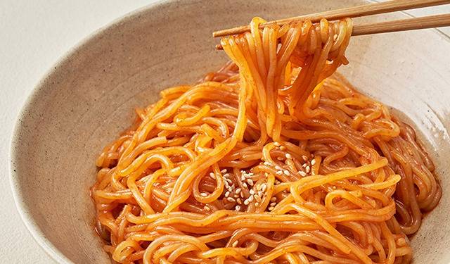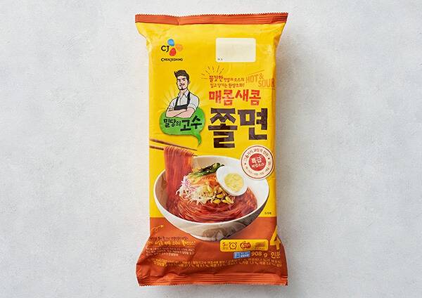 CJ제일제당에서 공급하는 ‘밀당의고수 매콤달콤쫄면’은 다양한 맛을 음미할 수 있는 제품이다. 소스는 6가지의 과일을 72시간 저온숙성해 만들기에 입에 잘 감기는 감칠맛을 선사한다. 쫄면의 생명이라 할 수 있는 면발은 압면 방식으로 꾹꾹 눌러서 제조하기에 탱글한 식감을 느낄 수 있다. 쫄면사리와 소스, 그리고 참깨와 김고명이 함께 제공된다. 4인분 구성으로, 패키지 판매가는 9,480원이다.