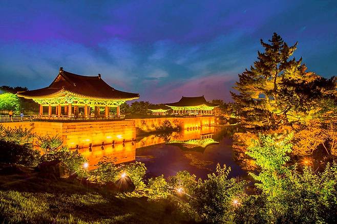 조명은 연못 위의 물결과 고풍스러운 건축물에 아름다운 그림자를 만들어내며, 마치 시간을 거슬러 신라의 궁궐을 거니는 듯한 기분을 느끼게 합니다.