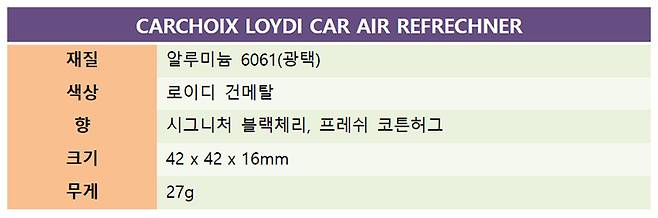 카슈아 로이디 차량용 방향제 케이스는 AL6061 소재로, 순수 알루미늄에 마그네슘과 실리콘 등을 첨가해 가공성과 내식성 및 강도가 우수한 특징을 가지고 있다. 여기에 윗면을 여러 면을 가진 다이아몬드 느낌의 디자인을 적용하고 아노다이징 처리로 변색을 방지하고 있다. 색상은 건메탈과 플래티넘 두 가지 중에서 선택할 수 있다.