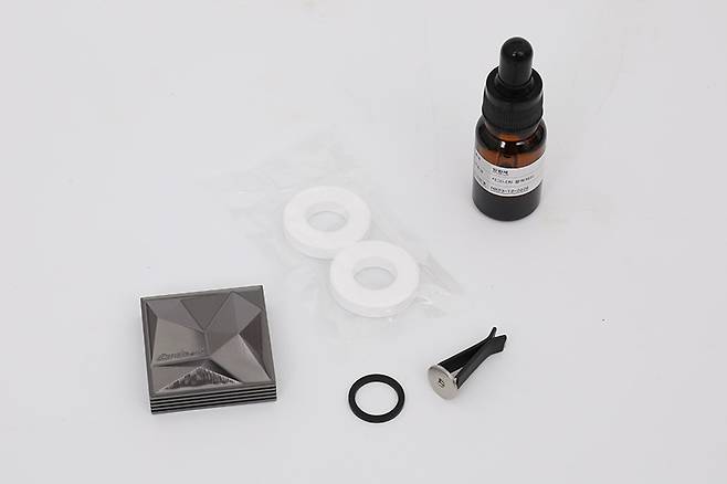 상자를 열어보면 안쪽에 파여진 홈에 구성품이 가지런히 담겨 있다. 구성품은 카슈아 로이디 차량용 방향제 케이스와 송풍구 클립, 두 개의 방향제, 그리고 프래그런스 오일 10㎖ 하나로 구성되어 있다.