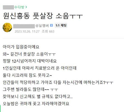 글쓴이는 “장안구 주택가에 들어선 풋살장이 밤 10시까지 운영하며 밤에도 소음과 불빛 공해로 주민들이 고통으로 호소하고 있다”며 “쉬는 시간에는 (집 앞에서 흡연해) 담배 냄새가 진동해 풋살장 코 앞에 사는 주민은 미칠 지경”이라고 했다.