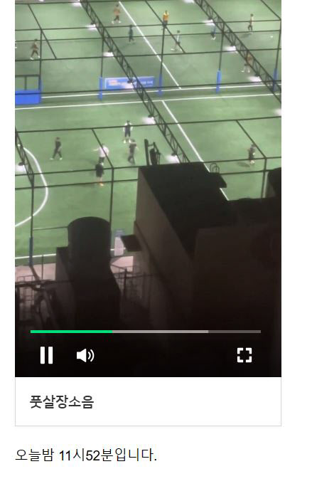 글과 함께 올라온 영상을 보면 창문을 열자마자 운동하는 사람 얼굴이 다 보일 정도로 가까운 거리에서 풋살 경기가 펼쳐지고 있다. 집 안에서도 풋살장에 있는 사람들과 대화가 가능할 정도로 가깝다. 올 5월 오픈한 이 풋살장은 주택과 불과 2m 거리에 있다.