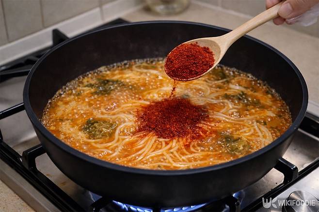 7. 고춧가루 1큰술과 김칫국물 2큰술을 넣어 한 번 더 끓인다.