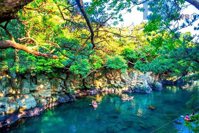 민물이 유독 푸르고 맑아 기암괴석 밑 숲의 풍경을 거울처럼 비춘다.