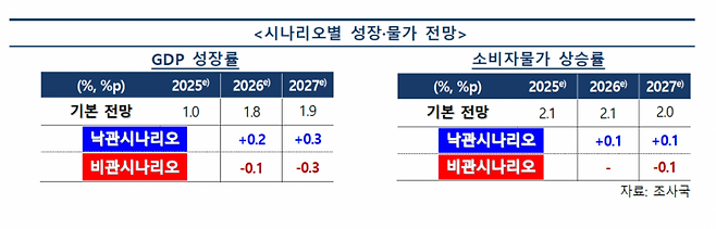 기본 시나리오는 내년 1.8% 성장, 2027년 1.9% 성장이다. 반도체 수출 물량 증가세가 올해 10% 중반에서 내년 7%대, 내후년 5%대로 완만히 둔화하는 것으로 가정했다.