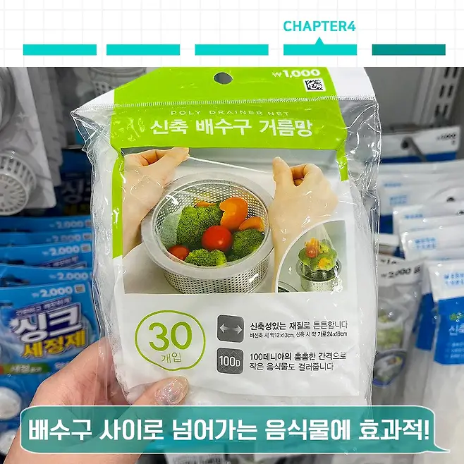 이거 알고 나면 떨어질 때면 나가서 무조건 쟁여올걸요? 배수구에 음식물이 차면 음식물 버리고 배수고 사이로 넘어가는 음식물 때문에 막히면 골치 아파지는 데 그걸 해결해 줄 신축배수구 거름망입니다.