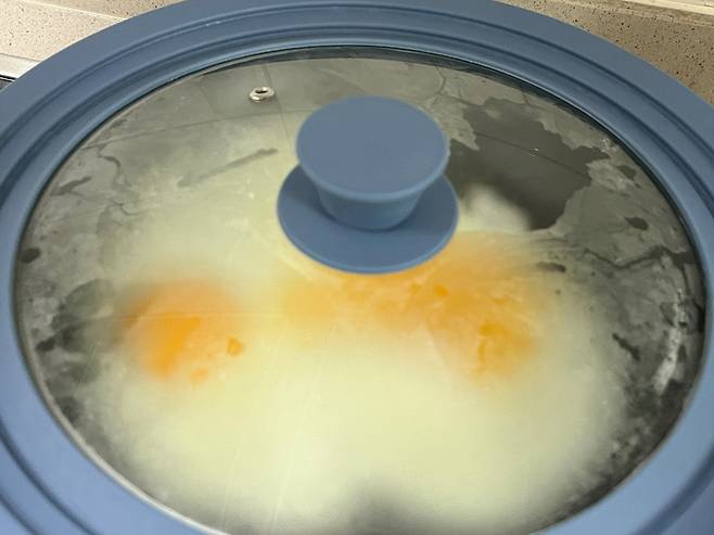계란을 넣은 후 뚜껑을 닫아 약불에서 약 1~2분 가열해 줍니다. 취향에 따라 반숙 또는 완숙으로 익혀서 드셔 보세요. 이렇게 하면 기름은 하나도 쓰지 않고, 빠르게 계란후라이를 만들어낼 수 있습니다.