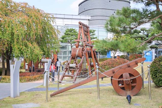 수원 화성 박물관에서는 수원 화성 축성 과정을 다룬 ‘화성축성실’을 통해 정약용이 고안한 대표 축성기구인 거중기, 녹로, 유형거 등의 모형을 볼 수 있다. 다만 이들 실물 크기 모형은 박물관 입구의 야외전시장에서 전시되어 있어 내부 전시와는 공간적으로 구분된다.