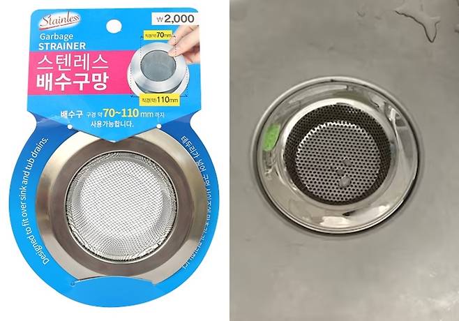 온라인 커뮤니티에서 대란템으로 떠올랐던 스테인레스 배수구망. 아래 부분이 곡선형으로 제작돼 음식물이 끼이지 않고 깔끔하게 사용할 수 있다. 스테인레스로 만들어져 쉽게 녹슬거나 파손되지도 않는다. 2000원이라는 착한 가격으로 판매하고 있어 동네마다 구하기 어려운 아이템이다.
