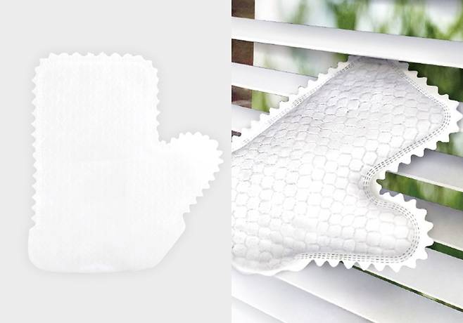 미세먼지 제거에 좋은 부직포로 만든 일회용 청소장갑이다. 굴곡이 많거나 틈새가 좁아 일반 청소도구가 닿지 않는 곳을 닦아내기 좋다. 특히 가장자리가 물결 모양으로 되어 있어 좁은 곳까지 닿는다. 창문 틈새나 자동차 내부 등을 청소하는 용도로 사용할 수 있다. 가격 12개입 1000원.