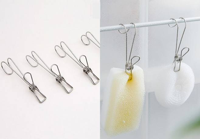 무엇이든 뭐든 걸어둘 수 있어 활용도가 높은 스텐걸이 집게. 건조대에 양말이나 신발같은 작은 세탁물을 걸어두거나 샤워할 때 쓰는 바디 스펀지를 벽에 닿지 않게 보관하는 용도로 사용할 수 있다. 메모지나 사진을 끼워 인테리어로 활용하는 방법도 있다. 가격 1000원.