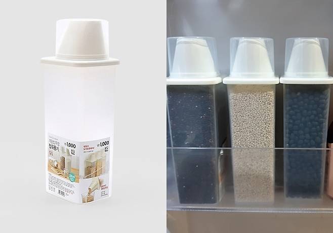 뚜껑이 계량컵으로 되어 있어 사용하기 편리한 잡곡용기. 50ml, 100ml, 150ml, 200ml 단위로 계량이 가능하다. 용량은 1.2l로 냉장도 도어 포켓에 쏙 들어가는 크기여서 깔끔하게 정리할 수 있다. 잡곡뿐만 아니라 사료, 시리얼, 밀가루, 견과류 등을 보관해도 된다. 가격 1000원.