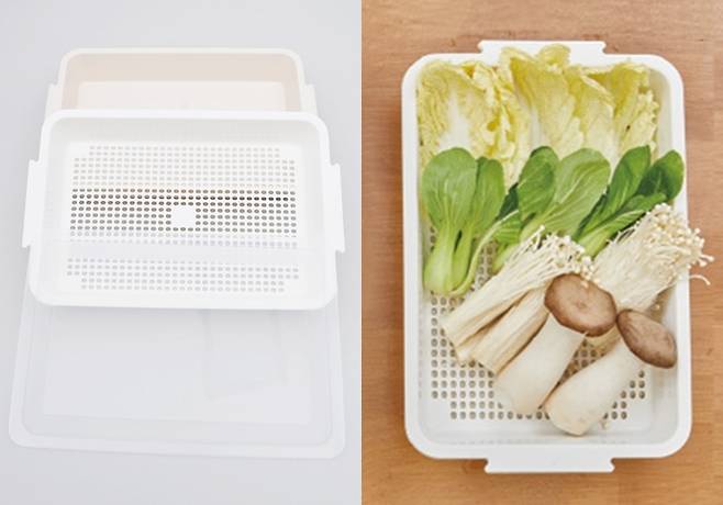 뚜껑과 채반, 받침으로 구성된 보관 용기다. 야채를 씻어 채반에 넣어두면 틈새로 물이 빠져나가 짓무름 없이 오랫동안 싱싱하게 보관할 수 있다. 튀김이나 생선을 넣어 기름을 빼는 용도로도 사용할 수 있다. 가격 3000원.