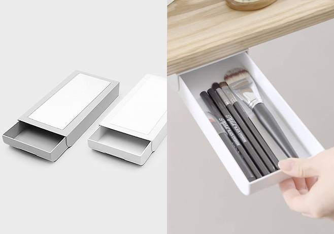테이블에 수납 공간이 없거나 부족할 때 활용하기 좋은 부착식 서랍장. 책상 아래에 펜이나 작은 간식을 보관해두는 용도로 사용 가능하다. 여기저기 흩어지기 쉬운 브러시를 담아 화장대 아래에 붙이거나 수저를 담아 식탁 아래에 보관할 수도 있다. 가격 2000원.