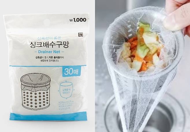 싱크대 청소를 더 쉽고 간편하게 해주는 일회용 거름망. 배수망에 끼웠다가 쏙 빼서 버리면 되므로 편리하다. 신축성이 좋고 간격이 촘촘해 고춧가루같은 작은 음식물까지 걸러준다. 배수망 외에도 작은 빨래를 넣어 세탁망으로 쓰거나 작아진 비누를 모아 넣는 비누망으로 사용할 수 있다. 가격 1000원.