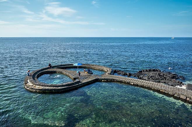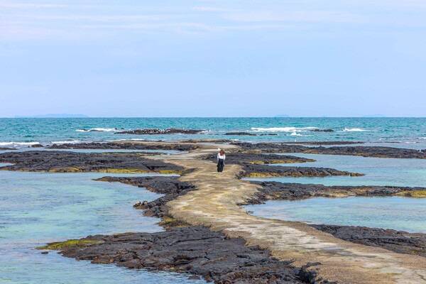 제주 올레길 20코스의 시작점, 서포구에서 마을 안길을 따라 걸을면 만날 수 있으며, 물통 끝에 앉아 찍는 인증샷이 상당히 인기가 많습니다. 청굴물과 제주 바다를 배경으로 졸업 사진을 남겨보세요.