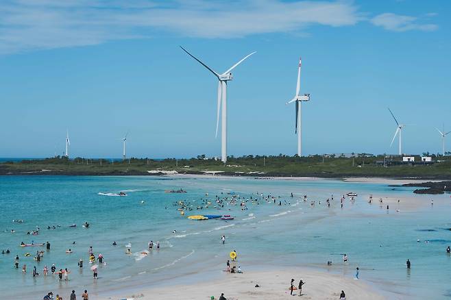 에메랄드빛 바다와 부드러운 백사장이 어우러진 구좌읍의 평온한 휴식처, 바로 김녕해수욕장인데요. 얕은 수심과 새하얀 백사장, 그리고 에메랄드빛 제주 바다의 풍경을 자랑하며 김녕성세기해변이라고도 불립니다. 주변에는 세월의 흔적을 겪은 기암절벽과 백색의 풍력 발전기의 조화가 상당히 이국적이죠.
