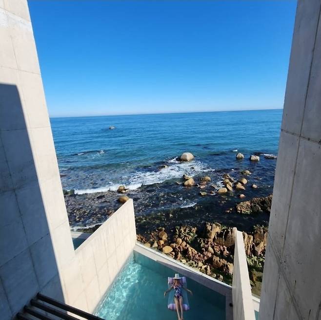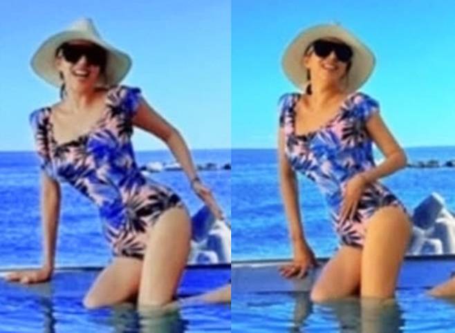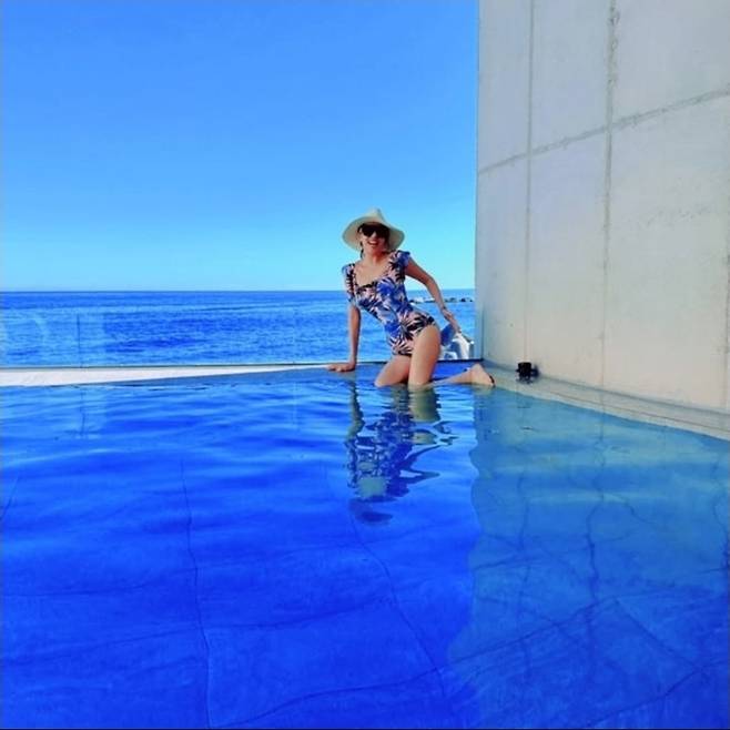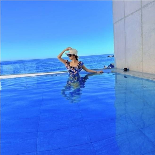 김완선은 선명한 바다를 배경으로 패턴 바디슈트 스타일의 수영복을 입고 인피니티 풀 위에서 여유로운 포즈를 선보였습니다.