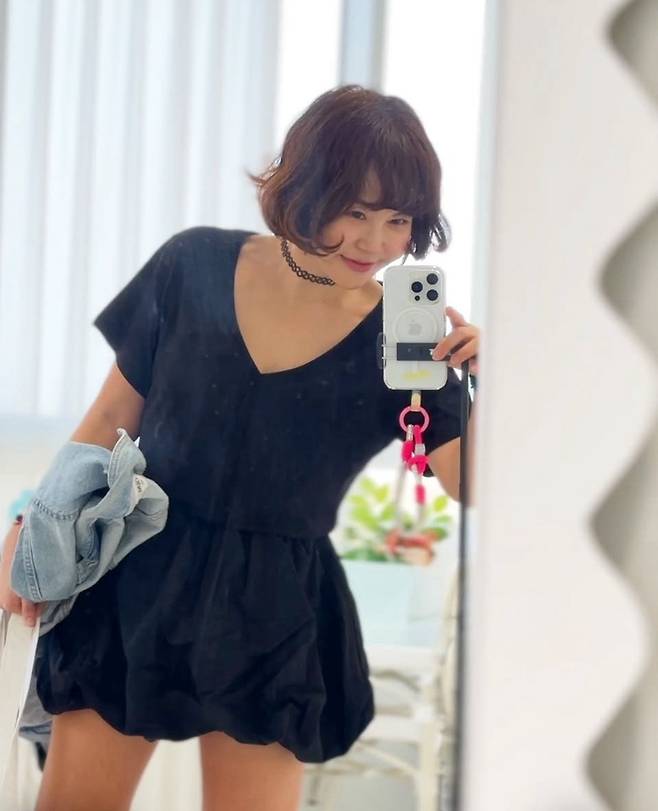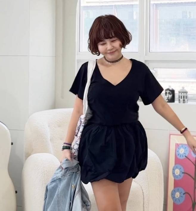 황혜영이 블랙 미니 점프슈트를 착용해 시크하고 도회적인 느낌을 주었습니다.