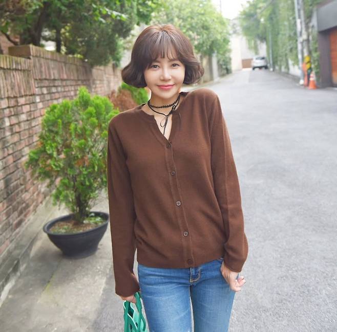 브라운 컬러의 버튼업 카디건과 슬림한 데님 팬츠를 매치해 내추럴하면서도 단정한 분위기를 연출했습니다.