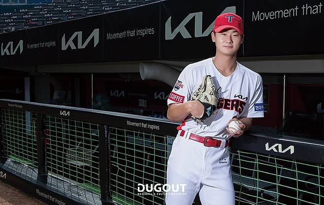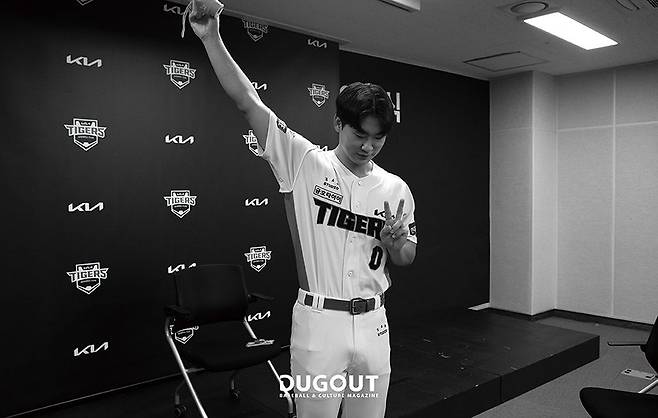 안녕하세요. KIA 타이거즈 곽도규입니다. <더그아웃 매거진>은 초등학생 때부터 자주 봤어요. 당시에 엄마가 도서관에서 강사로 일해서 저도 도서관에 있을 시간이 많았거든요. 매달 잡지를 사서 볼 만큼의 용돈은 없어서 자주 읽으러 갔죠. 월간지는 신간이 나오면 과월호를 무료로 나눠줬는데, 그럴 때마다 아침 일찍 도서관에 뛰어가서 받아왔어요. 가져와서는 동생하고 가위바위보로 갖고 싶은 화보를 나누고, 사진을 잘라서 방 벽에 붙이기도 했거든요. 그렇게 모으던 잡지였는데 이제는 제가 나온다고 하니까 신기하네요.