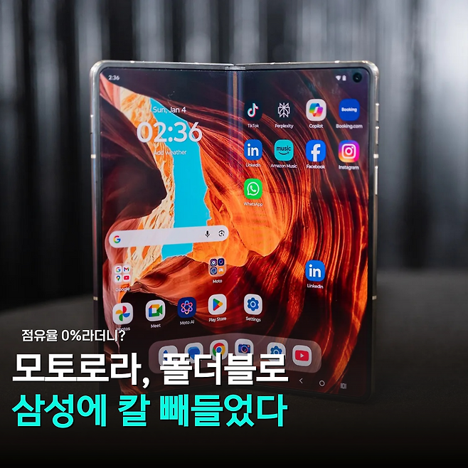 한국에서는 "하루 1대도 안 팔리던" 브랜드로 인식되던 모토로라는 CES 2026에서 첫 대화면 폴더블폰 '레이저 폴드'를 공개하며 삼성과 같은 인폴딩 구조와 플래그십 사양으로 정면 경쟁에 나섰다. 국내 인식과 달리 글로벌 폴더블폰 시장에서는 이미 점유율 2위를 기록하고 있으며, 삼성의 독주 구도를 흔들 수 있는 변수로 떠오르고 있다.