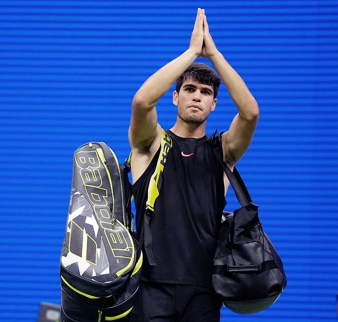 | 관중에게 인사하며 퇴장하는 알카라스 카를로스 알카라스가 30일 US 오픈 테니스 대회 남자 단식 2회전에서 보틱 판더잔츠휠프에게 0-3으로 패한 뒤 경기장을 나가며 관중에게 인사하고 있다. 뉴욕=AP 뉴시스 |