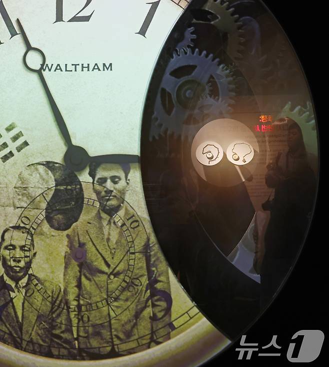 (서울=뉴스1) 오대일 기자 = 11일 오전 서울 중구 덕수궁 돈덕전에서 열린 '빛을 담은 항일유산' 특별전 언론공개회에서 방문객들이 백범 김구 선생(오른쪽)과 윤봉길 의사가 의거 당일 교환한 회중시계를 살펴보고 있다.