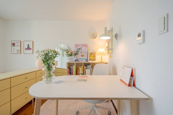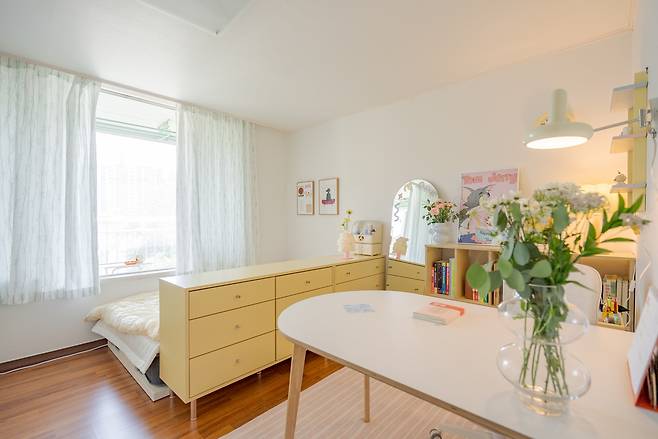 접어서 보관하는 옷들도 보관할 수 있게 노란색의 서랍장도 배치해 주었는데요. 공부 공간 옆으로 배치해 침대 공간과 분리가 가능하도록 해주었어요.