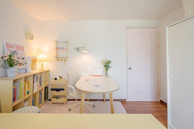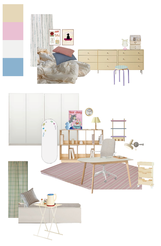 그래서 꾸미님이 좋아하는 버터색이나 노란색에 분홍색, 민트색, 하늘색, 연보라색을 더해 공간을 꾸며 줄 예정이에요. 큰 가구나 패브릭에 버터색을 사용하고, 소품이나 작은 가구들에 다른 색감을 섞어 줄 예정입니다. 공부 공간을 가장 크게 횔용하되, 침실 공간과 분리가 가능하게끔 배치해 줄 예정이고, 수납 가구도 최대한 많이 배치해 줄 예정이에요.