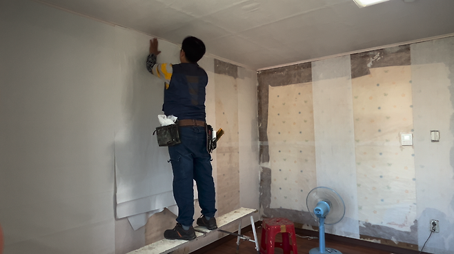 먼저 오래되어 바래진 벽지는 깔끔한 하얀색의 벽지로 새로 도배해 주었어요.
