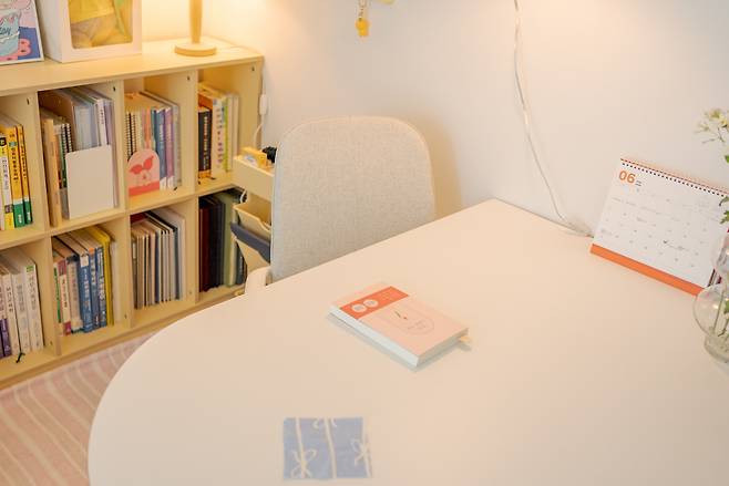먼저 책상 공간을 소개해 드릴게요. 우선 바닥 시공을 따로 진행하지 않았기 때문에 아래에는 분홍색 스트라이프 패턴의 러그를 깔아 콘셉트에 맞게 톤을 잡아주고 공간을 분리해 주었습니다. 이전에는 베란다 창을 바라보고 책상을 사용했었는데 조명을 등지다 보니 공부할 때 조금 어둡기도 하고 답답한 느낌이 들었다고 해요. 그래서 이번에는 책상이 앞을 바라보게끔 배치해 주었는데요.