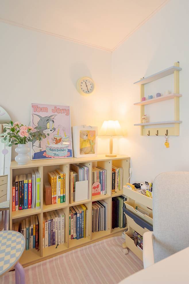 책장 위쪽으로는 공간 전체를 밝혀 줄 수 있는 단스탠드와 귀여운 색감의 포스터도 올려주었습니다. 그리고 바로 위에 버터색의 벽시계도 걸어주었어요.