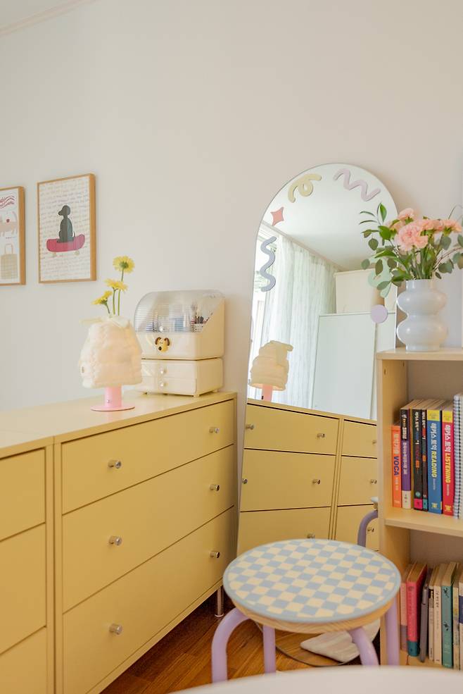 책장과 서랍장 사이에는 전신 거울을 두었는데요. 스티커를 활용해 공간에 더 잘 어울리게끔 꾸며주었어요. 여기서 옷매무새도 확인하고, 화장도 할 수 있도록 스툴도 함께 배치해 주었는데요. 스툴은 다리 부분이 연보라색이라 공간에 잘 어울리고, 위로는 체커보드 패턴의 방석도 깔아 주었습니다.